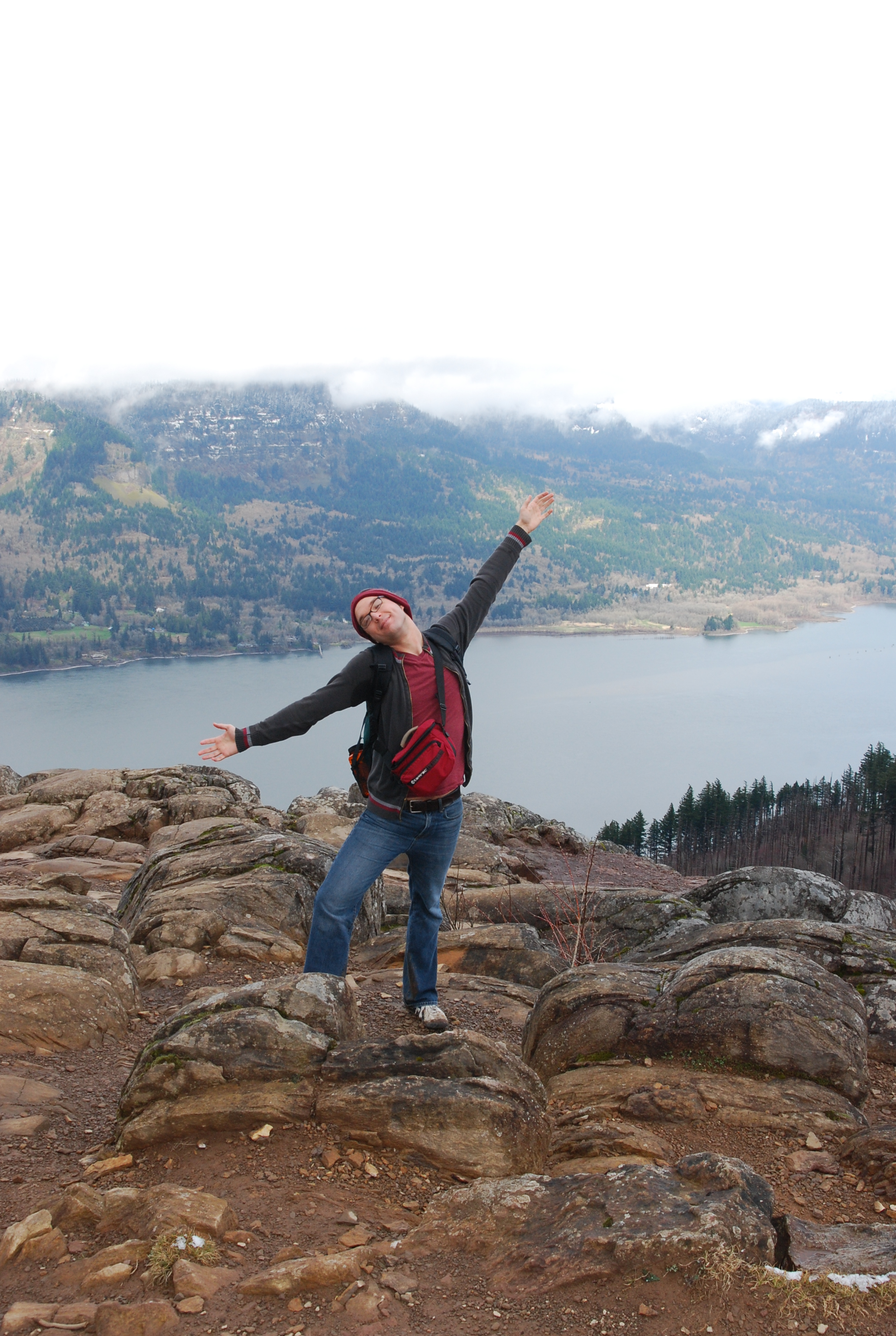 Robin was giddy at the top. His official hike summit portrait was a arms wide open moment of pure glee taking a page from Fraulein Maria.The view was lovely, 180 degrees of river as far as the eye could see and a backdrop of snowy firs. We stopped long enough to enjoy the view and the blue sky, then headed back after watching a slightly