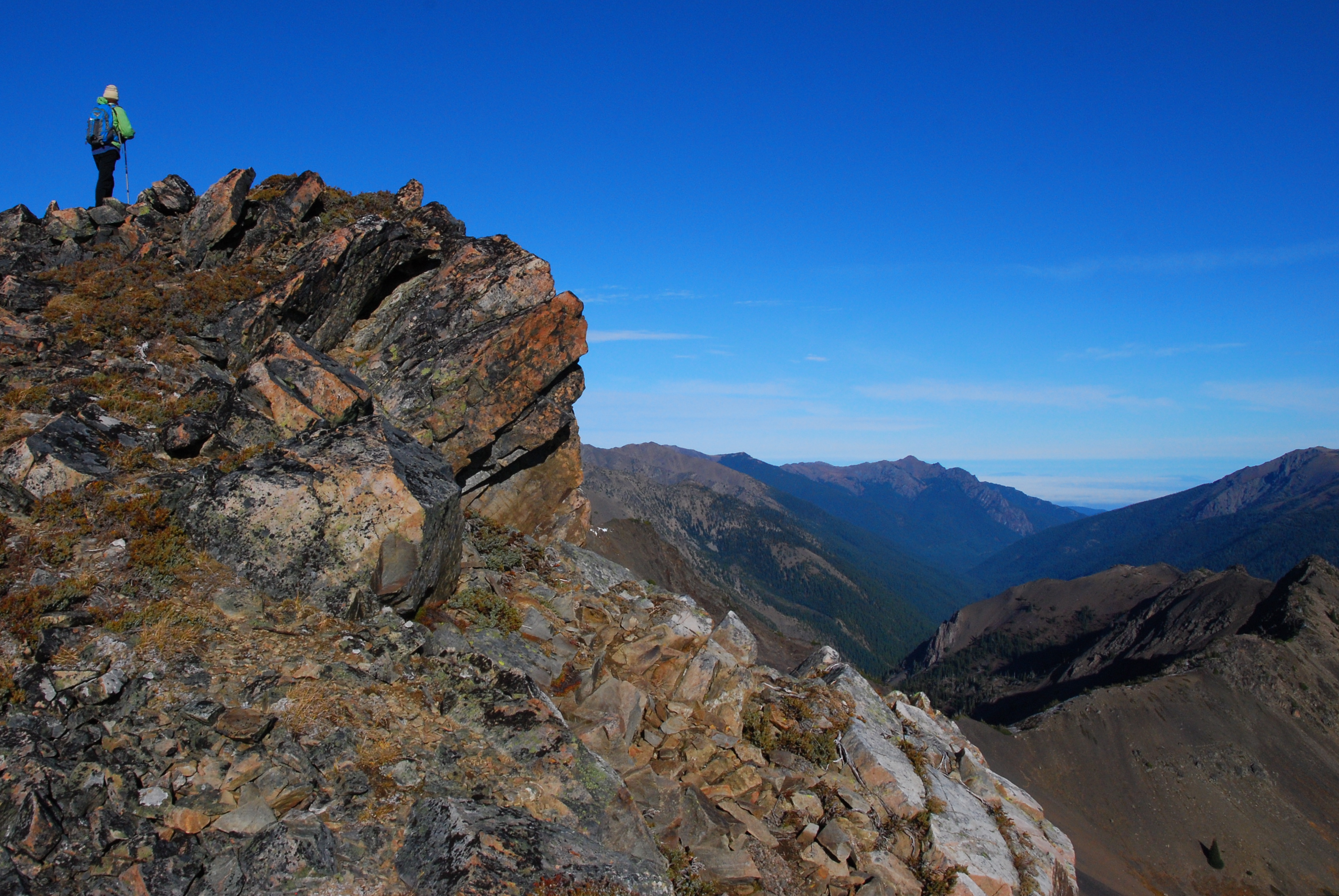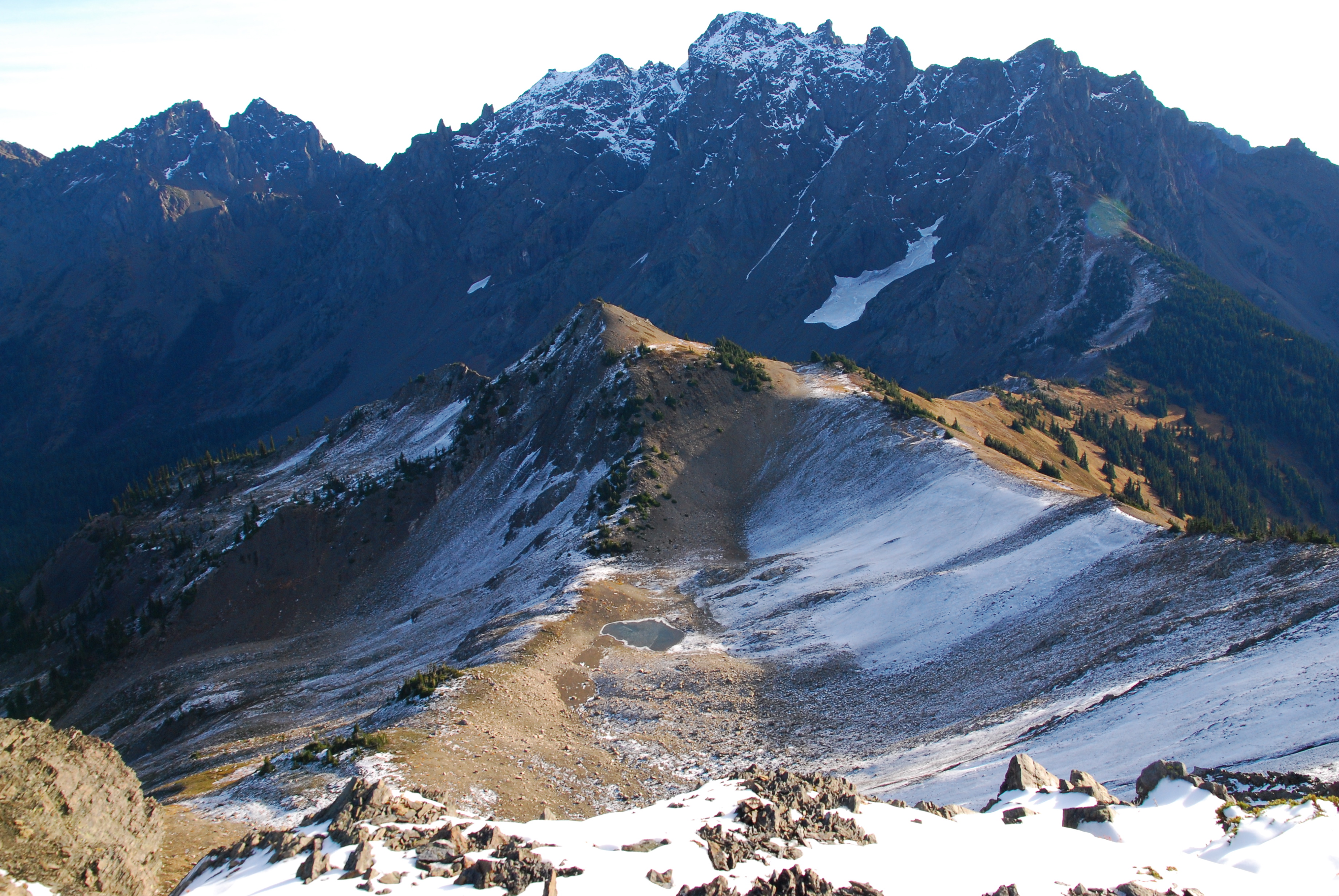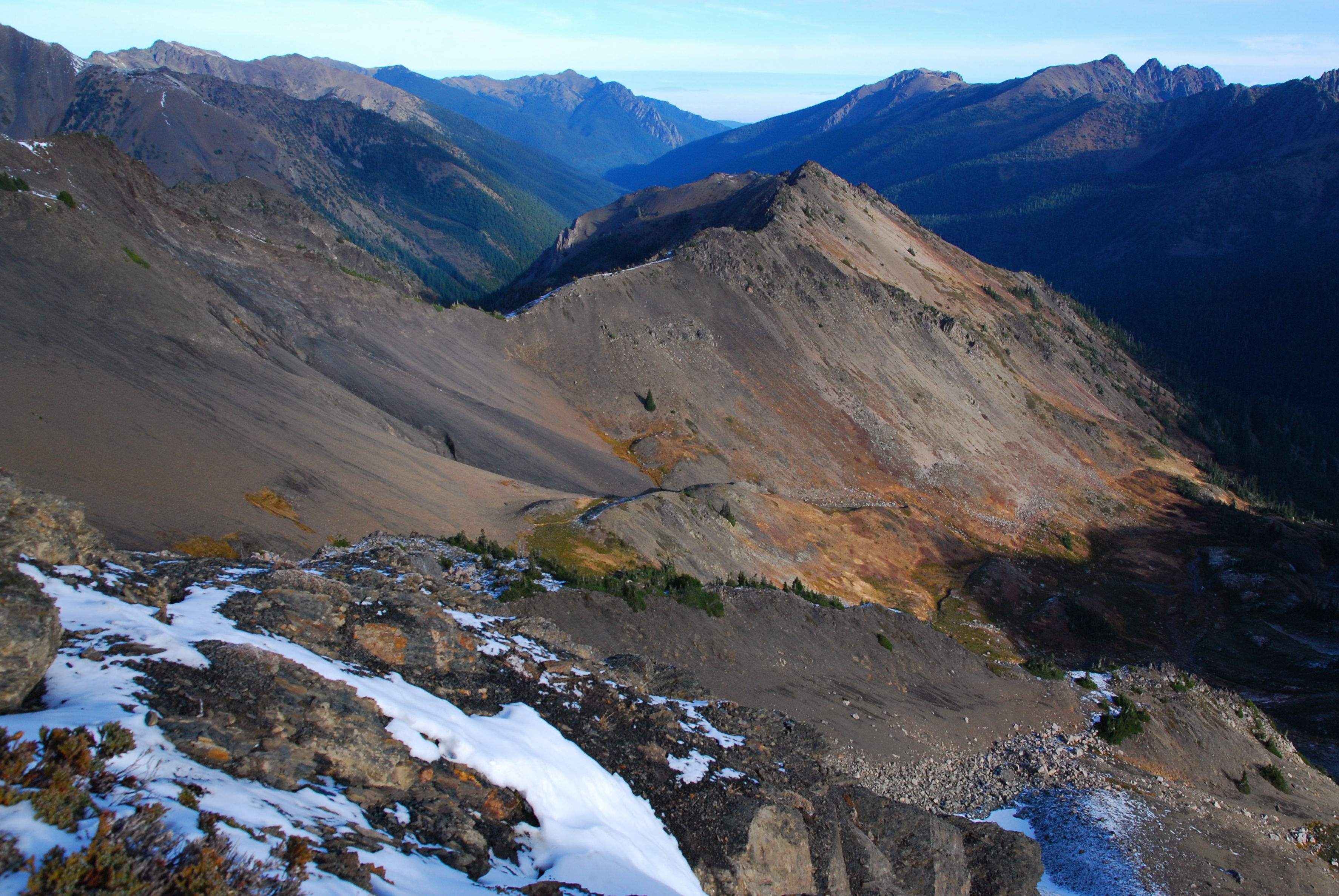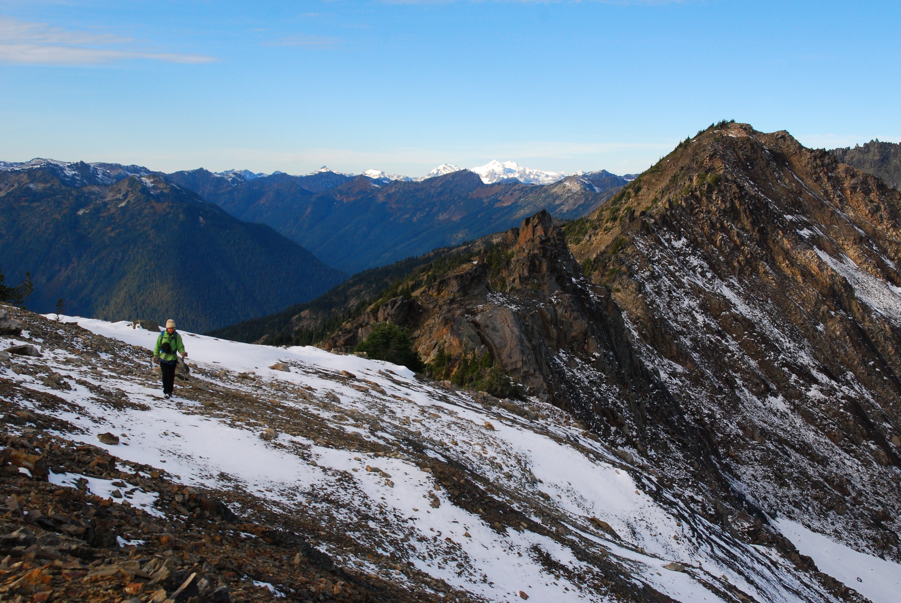 The thing about having something very close to 360° views is that you tend to forget about little things like eating and drinking. But, eventually, we remembered the existence of basic human needs, and had a leisurely breakfast. But we weren’t ready to give up the gawking just yet, so we decided to take a quick jaunt along the remainder of the ridge before heading out. We packed up our stuff then picked our way along the off trail but very easy route. The views changed pretty much every step. At the end of the ridge – or, at least, as far as you could go without some scrambling – there are gorgeous views down into Heather Basin and further still into the Olympic range.