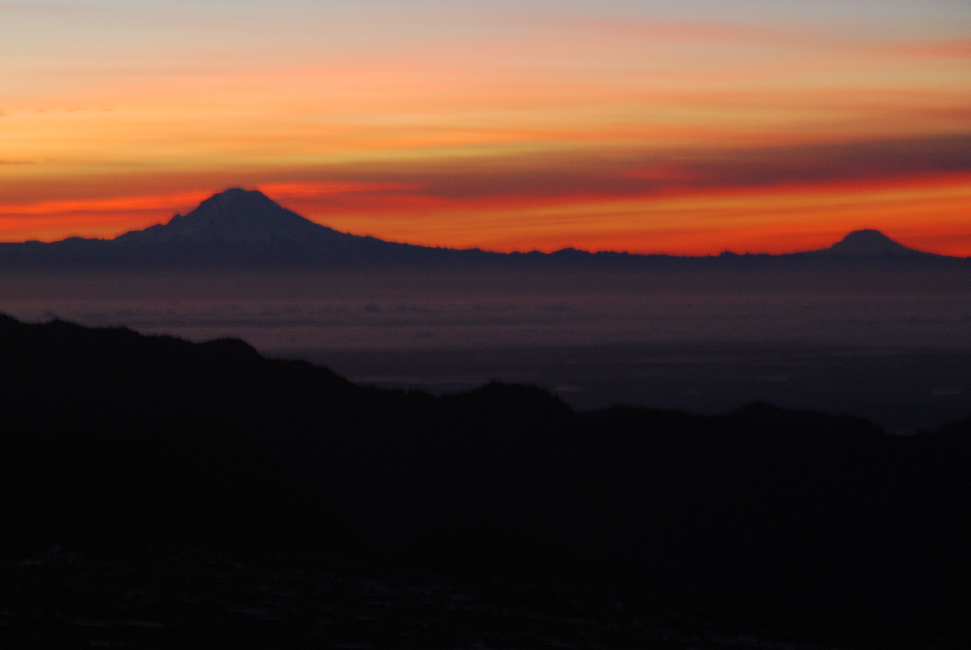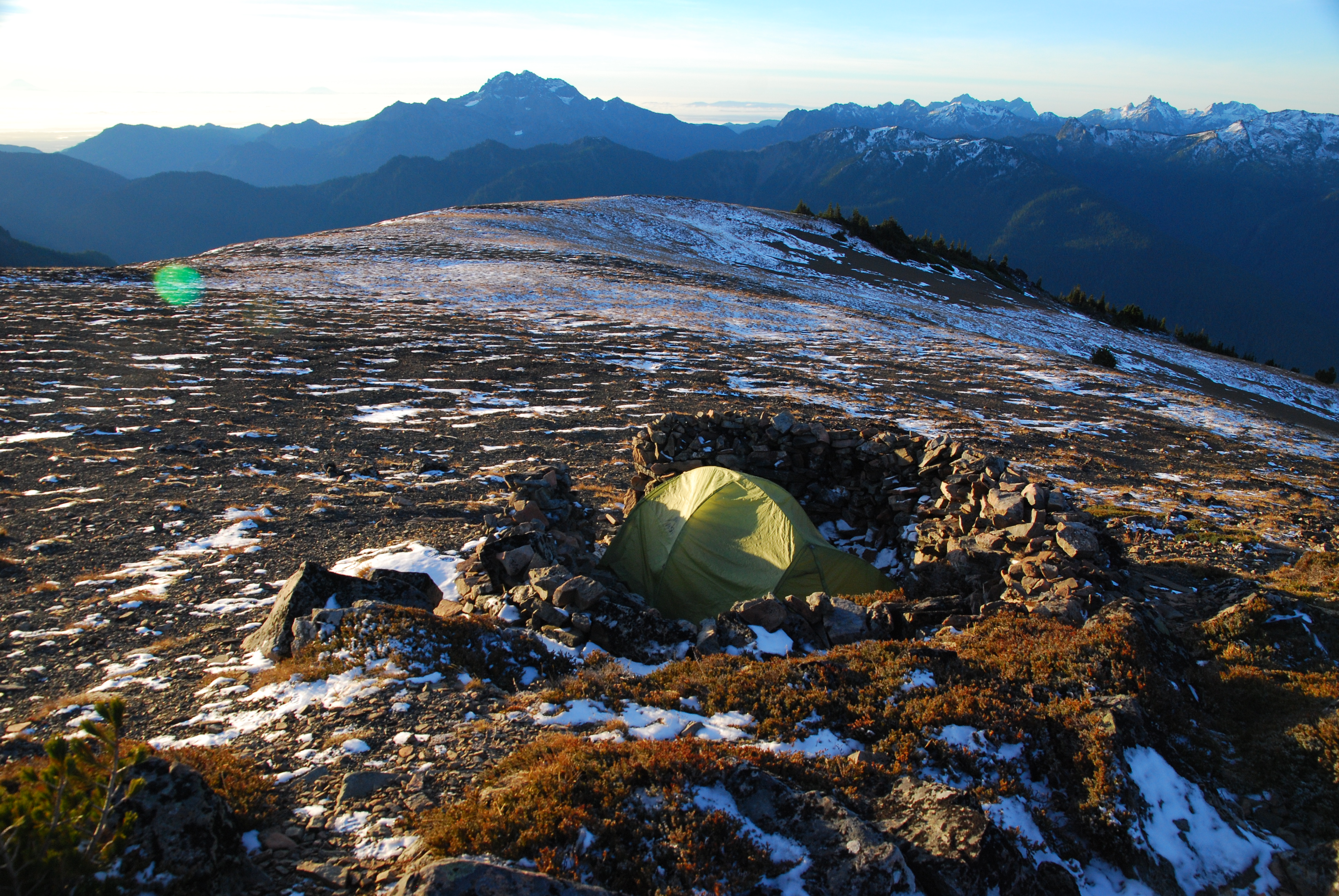 From the lake, it’s only a few hundred feet and maybe half a mile up to Constance Pass, where the views open up to the south over the Dosewallips drainage, to the west deep into the National Park, and east across the Hood Canal all the way to the Washington volcanoes. It was just incredible. We followed the trail as it continued up another 700′ or so to Del Monte Ridge, and just as we got to camp at the ridge’s high point, the sun began to set and all the mountains turned red.