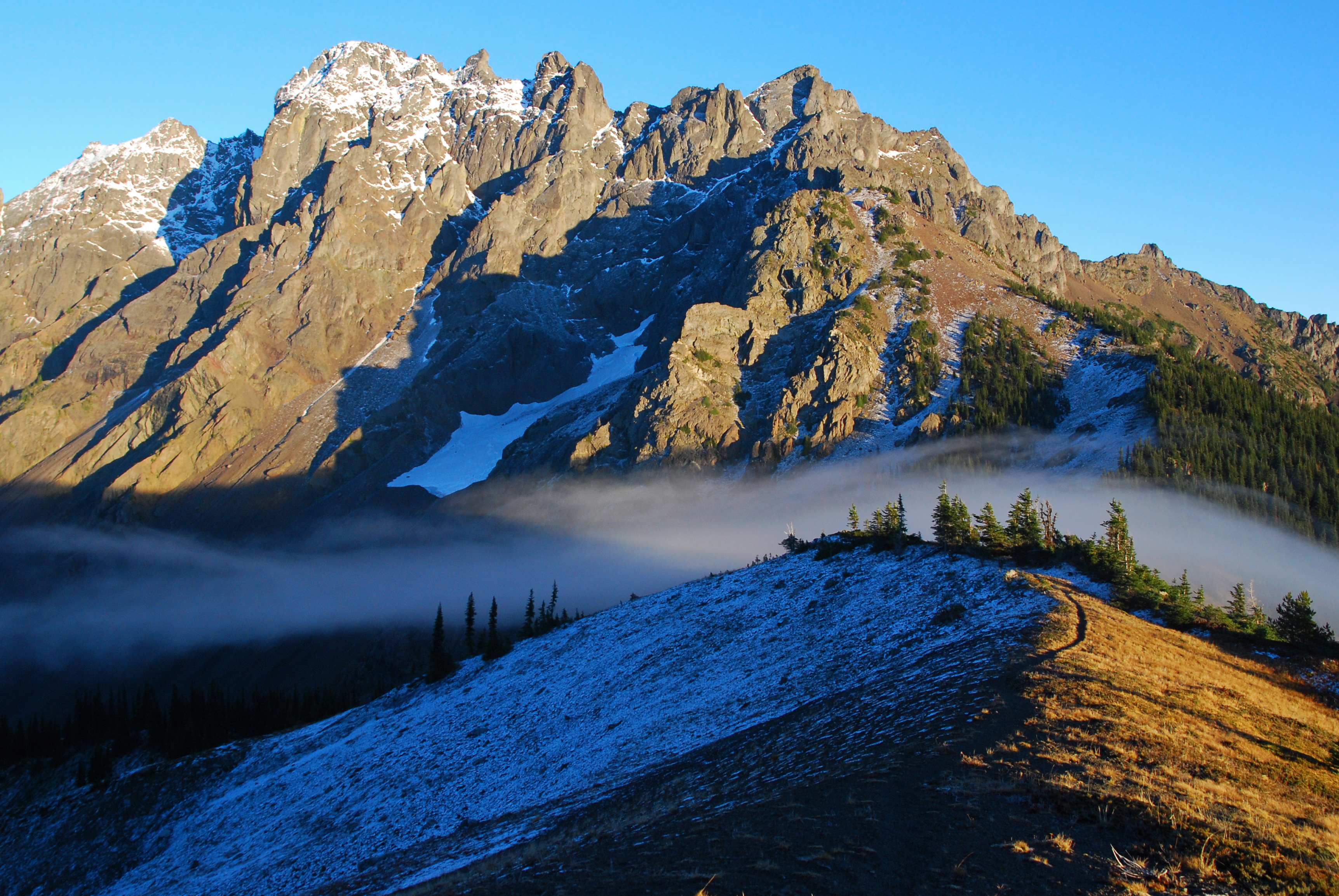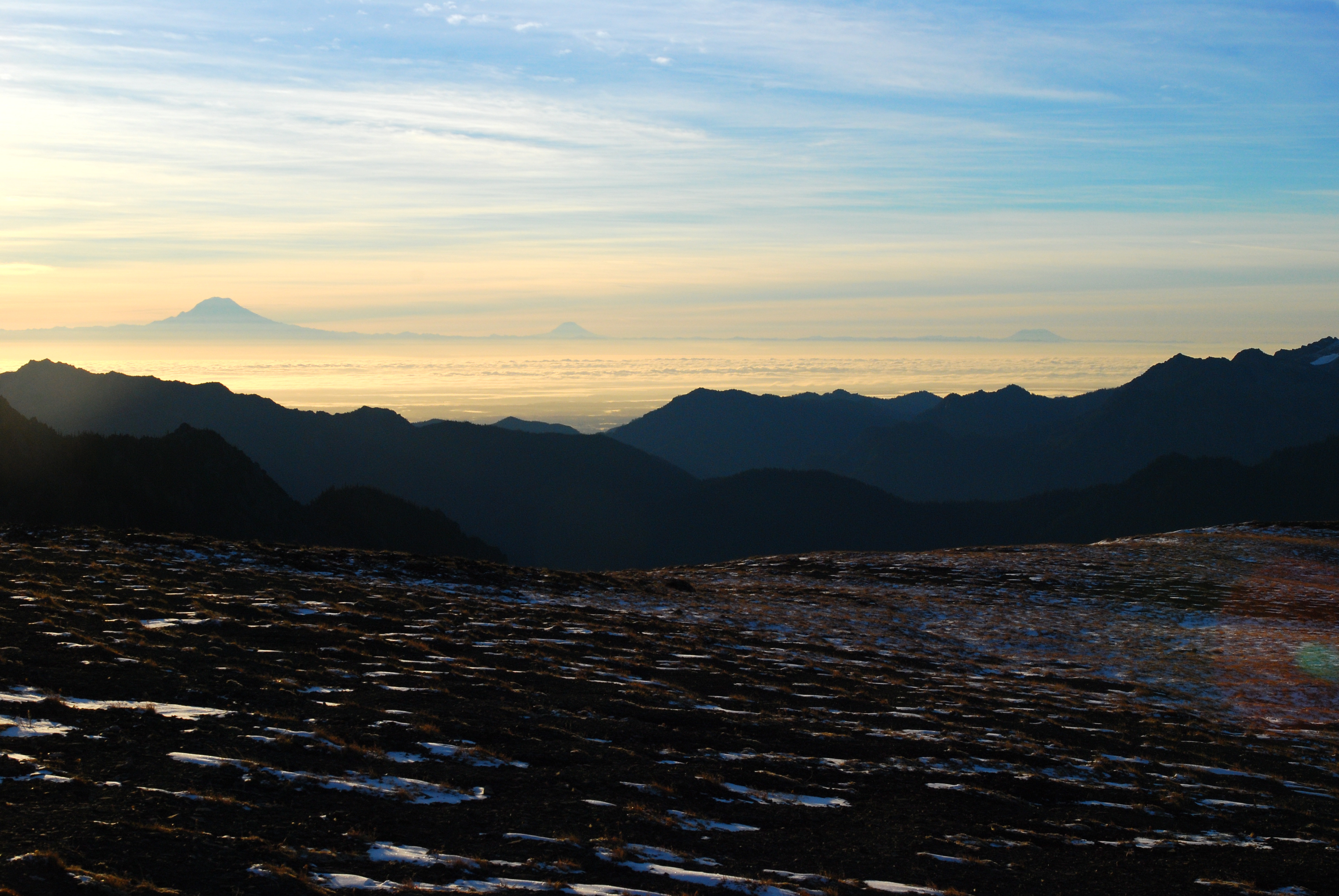 The night was cold – I went to sleep wearing nearly all of my clothes – but we woke up to a clear sunrise over the Washington volcanoes. Before breakfast, I ran around for a while taking pictures of all the things I’d only sort of noticed on the way in, mostly the ranges and ranges of peaks looking south into the Park.