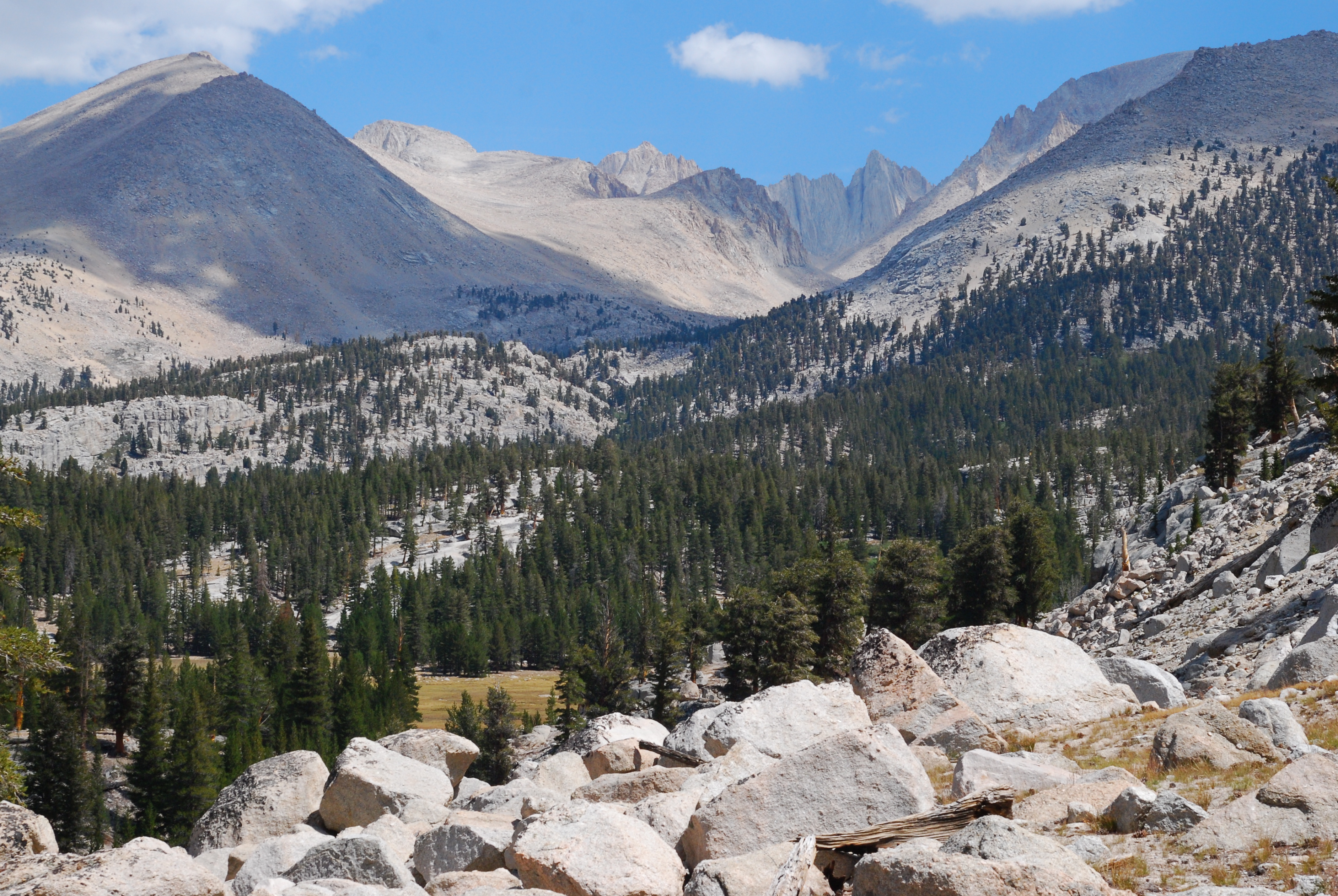 Our flat trail winds around a corner and all of a sudden the pines (and trail) drop away to reveal the Mt. Whitney complex of mountains – Mounts Young, Hale, Whitney, Russell, Muir, and Hitchcock, among others – giants looming over a landscape that now looks very small in comparison.