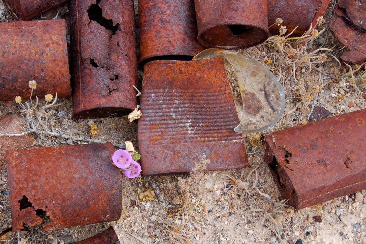 The last inhabitants left in the 1970s, which feels all too recent. Carefully picking our way back to the car through the tetanus wonderland, I notice desert fivespot flowers poking up through the rusted cans, and the cactus are all in full bloom. More surprises.