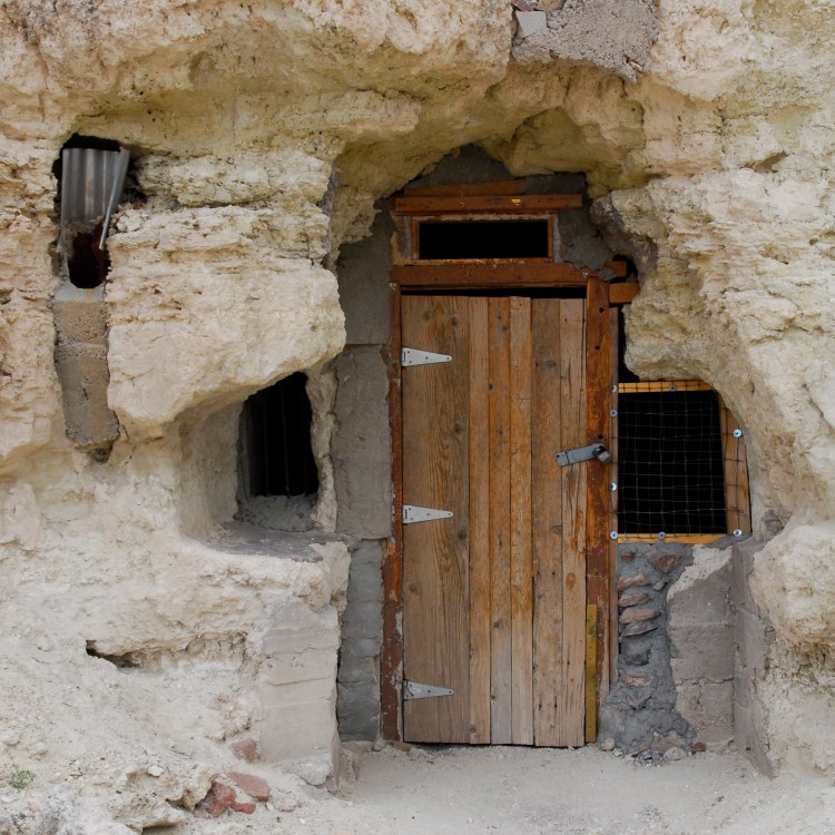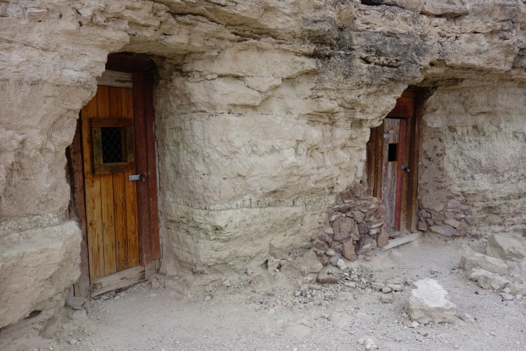 We make a quick stop at the Dublin Gulch Caves, an old mining settlement dug into the hills outside of Shoshone in the 1920s. The cave apartments are complete with stovepipes, windows, and doors; peering into the windows, several still contain rusted bed frames. The hills form a horseshoe shape with a a clear space in the middle used as a group garbage heap, which has now settled into mountains of rusted cans, bed springs, and broken glass.