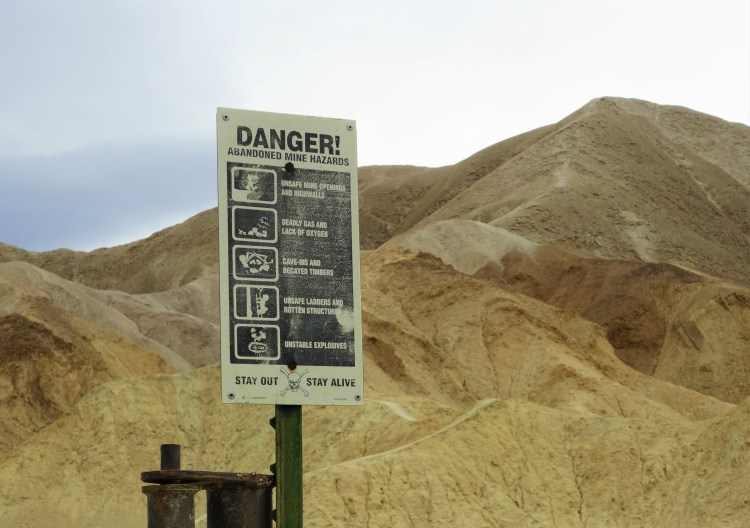On a whim, we decide to drive all the way beyond the southern border of the park to find the China Ranch Date Farm in Tecopa. Before exiting the park, we detour through the 20 Mule Team Canyon drive, which is filled with such delightful warning signs as this: