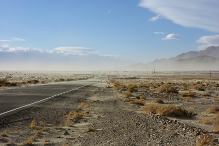 We hit a violent windstorm driving through the Owens River Valley, howling gales sending clouds of sand and salt whipping across the highway. Robin pulls over for me to run out and get a photo, an action I immediately regret.