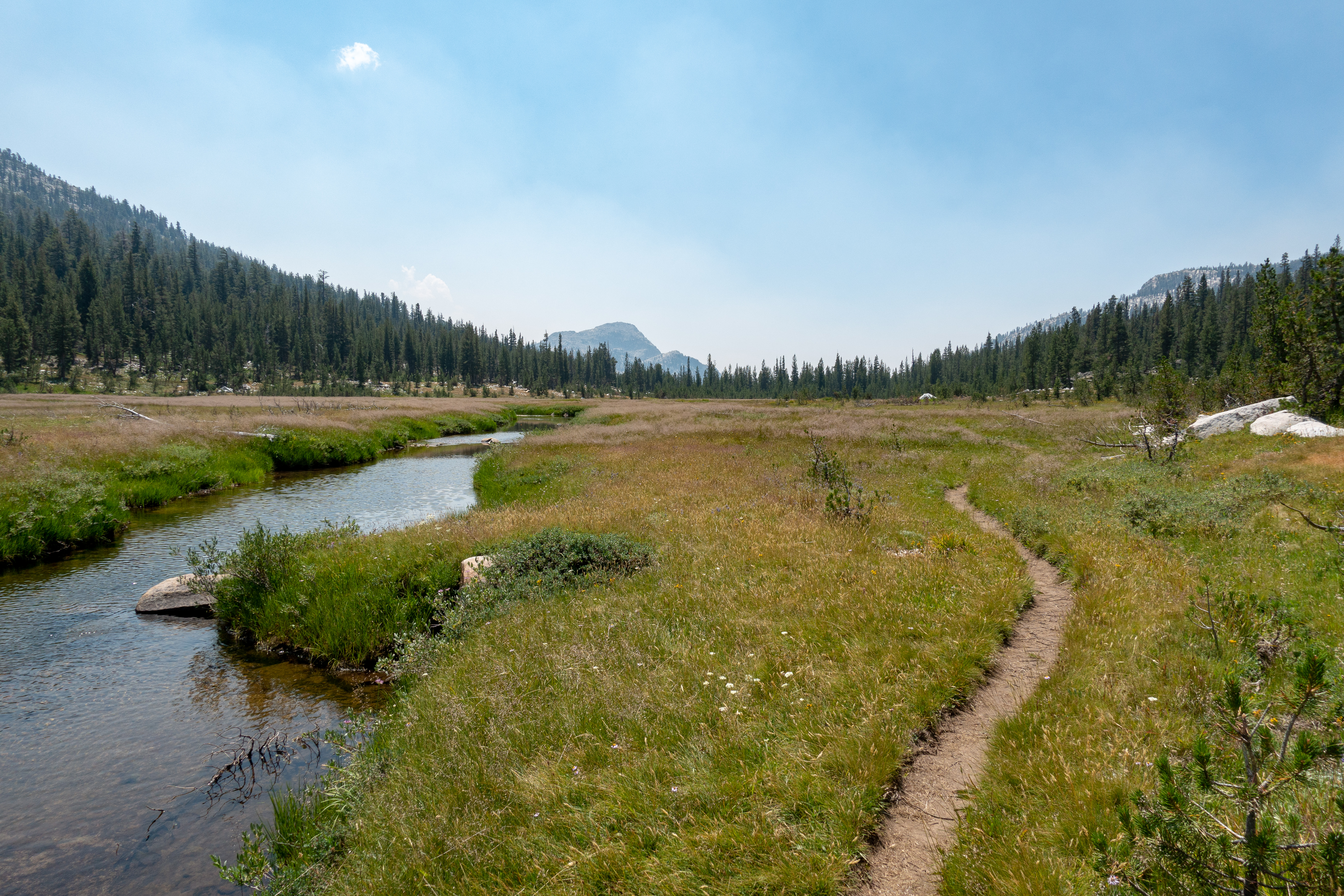 Grace Meadow is decked out in carpets of purple lupine, Queen Anne’s lace, and yellow asters. Falls Creek is my constant companion, which now is a placid sheet of water winding to my right. Looking behind me, large tufts of forest fire smoke rise out of the drainage I just left.