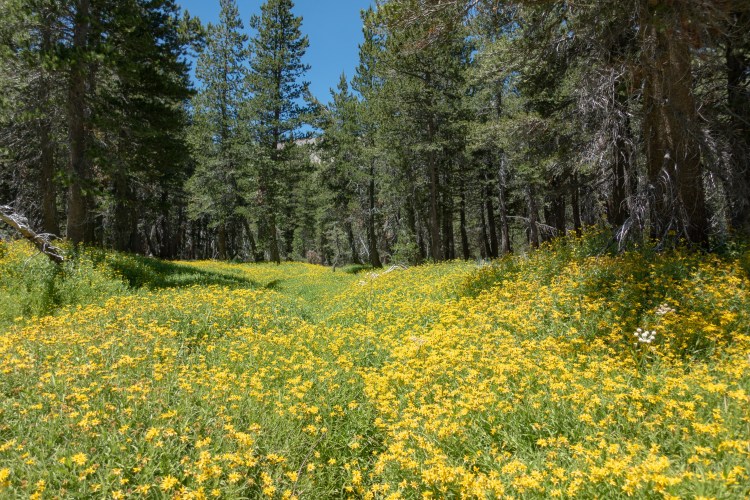 While the trail up Kennedy Canyon should be easy and gradual, it is slow going with the heat. I stop at the final easy water for a shamefully long time–an hour–soaking my unhappy toe in the icy water and basking in the creekside shade. The spot is overflowing with waist-high yellow wildflowers which sway gently in the breeze, disappearing back into the pine trees as far as I can see. Hundreds of little orange butterflies are clustered in the sun alongside the creek, lazily opening and closing their wings. I enjoy the shade while they enjoy the sun, but I think we all agree that this is an absolutely perfect spot.