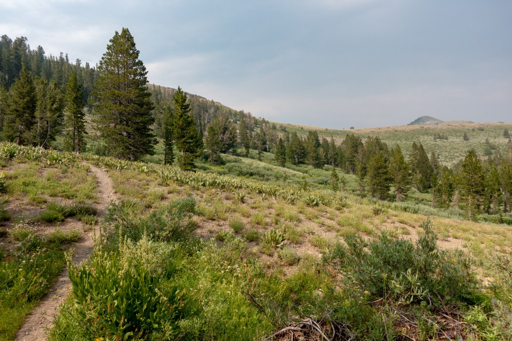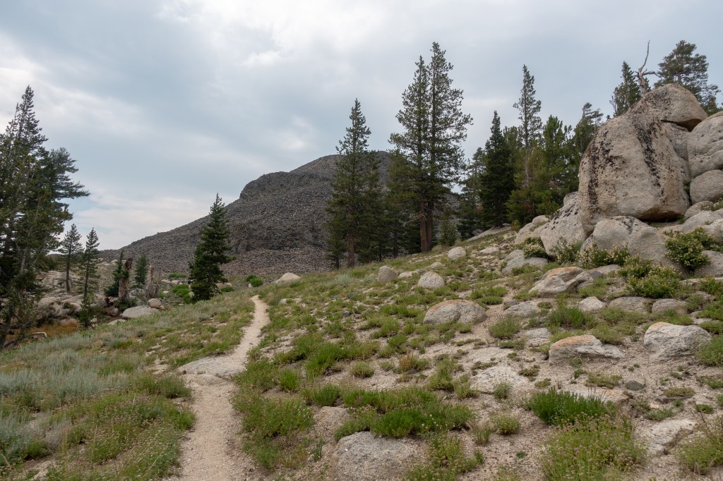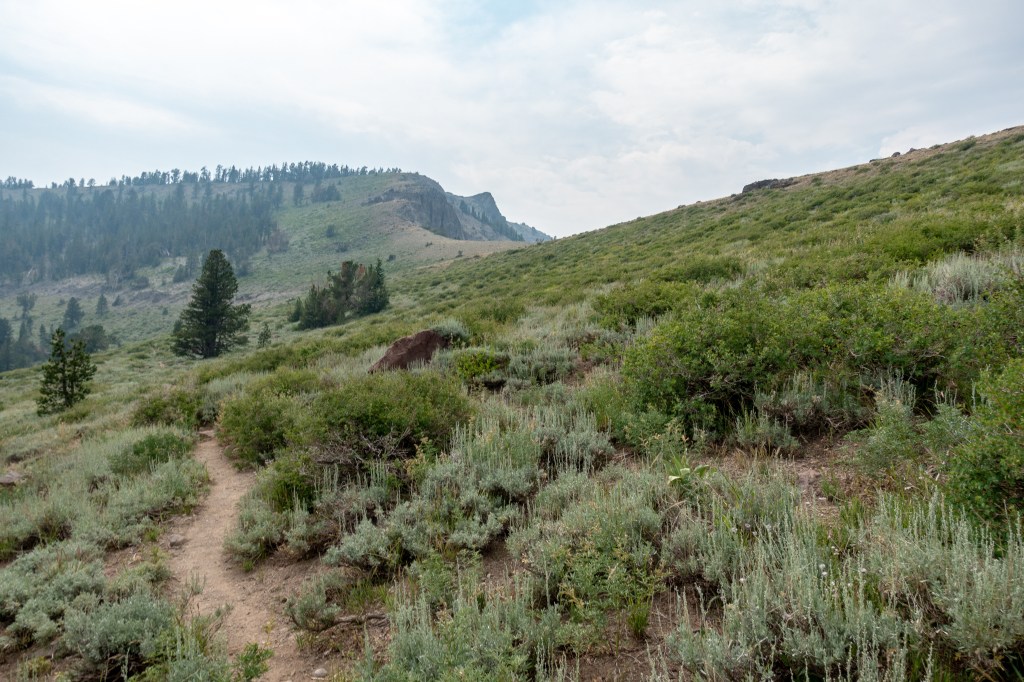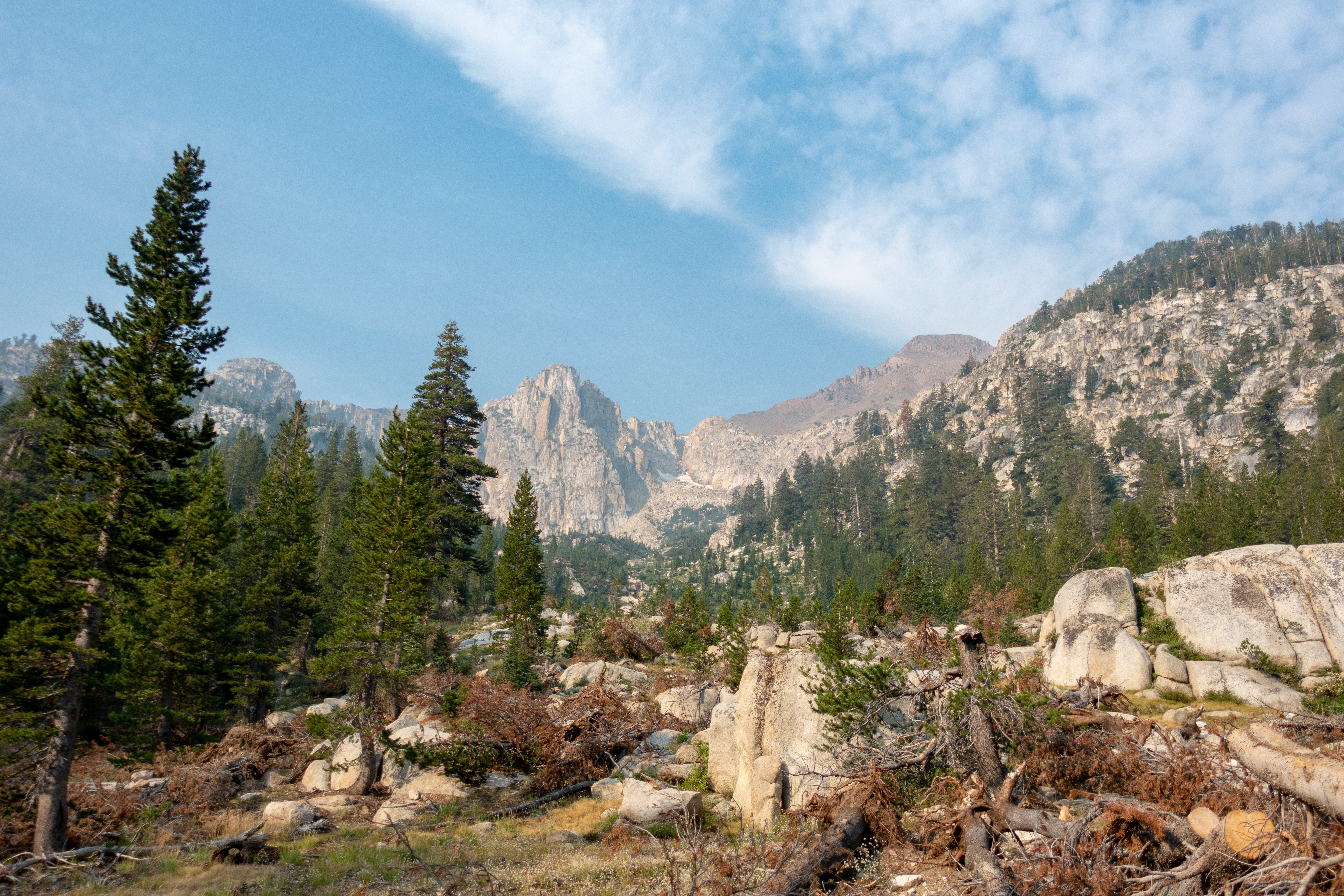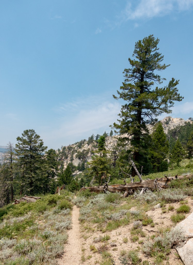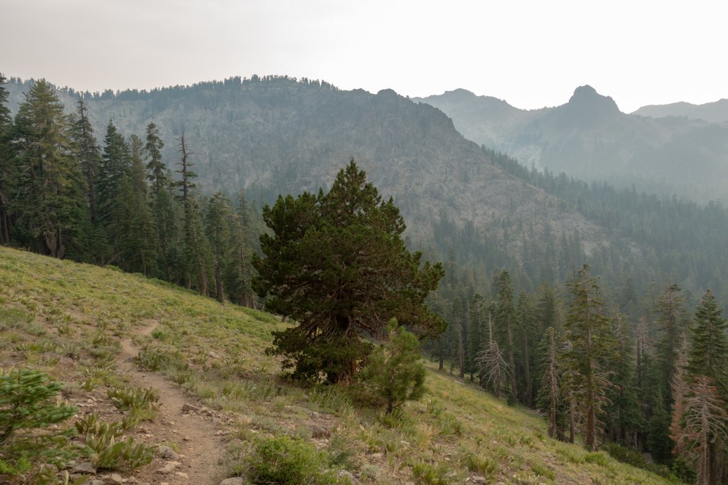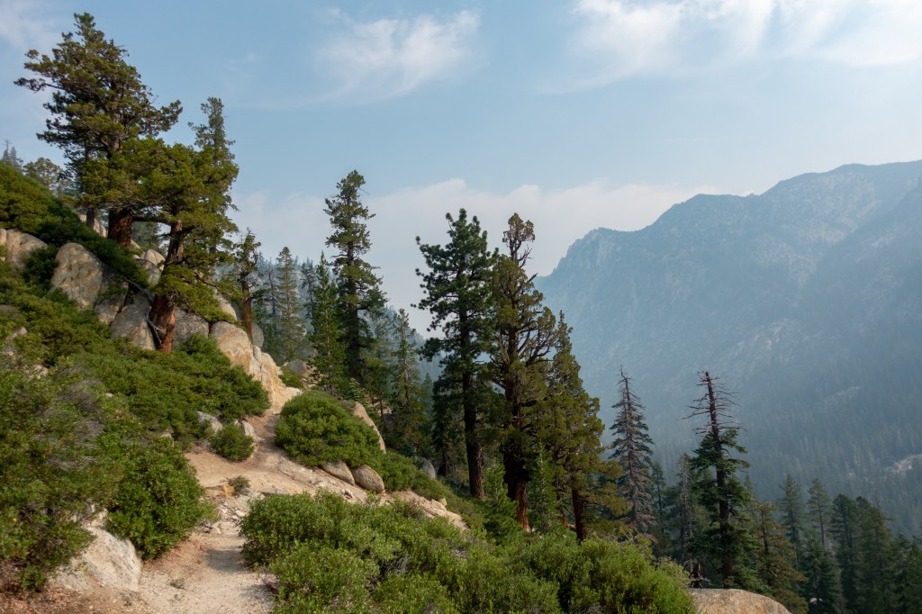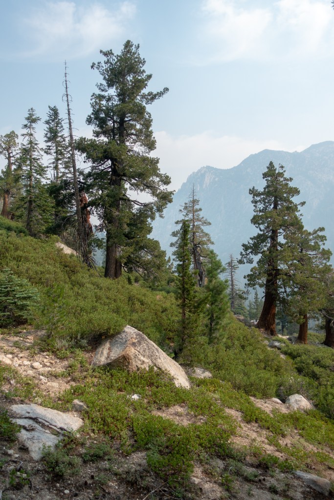 The easy miles come to an end as the trail abruptly hairpins up and backwards in a steep switchback, depositing me back in the sun, heat, and smokey haze. The thick network of pine trees in the valley floor quickly gives way to pine mat manzanita and exposed rock as the trail continues its path directly up the canyon wall.