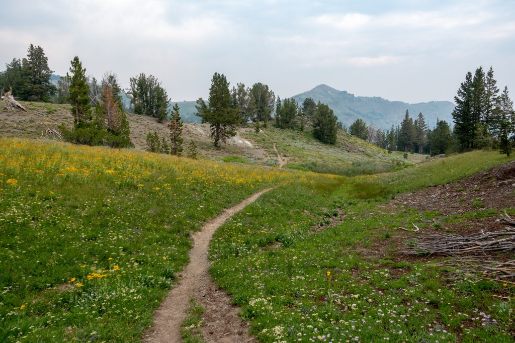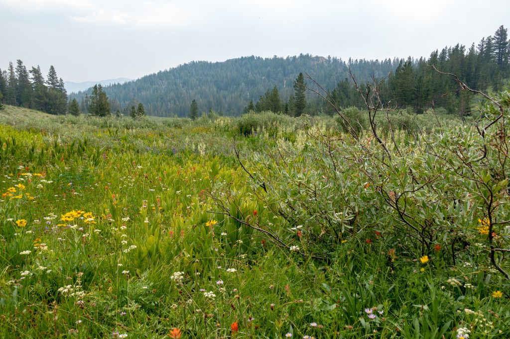 As the afternoon advances, the landscape softens into gentle hills and sparser trees. A full palette of greens — the silvery sagebrush and willows, the emerald grass, the dark and dusty pines — blend into one another, punctuated by mats of golden flowers and purple lupine as the warm, sweet scent of clover drifts through the air.
