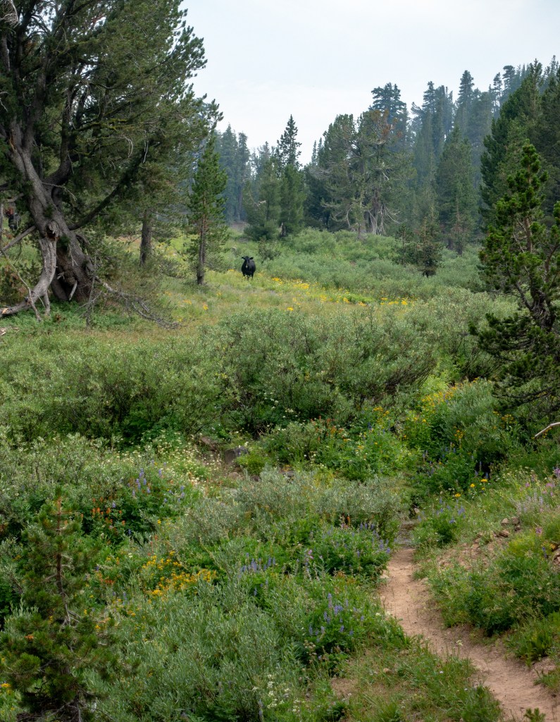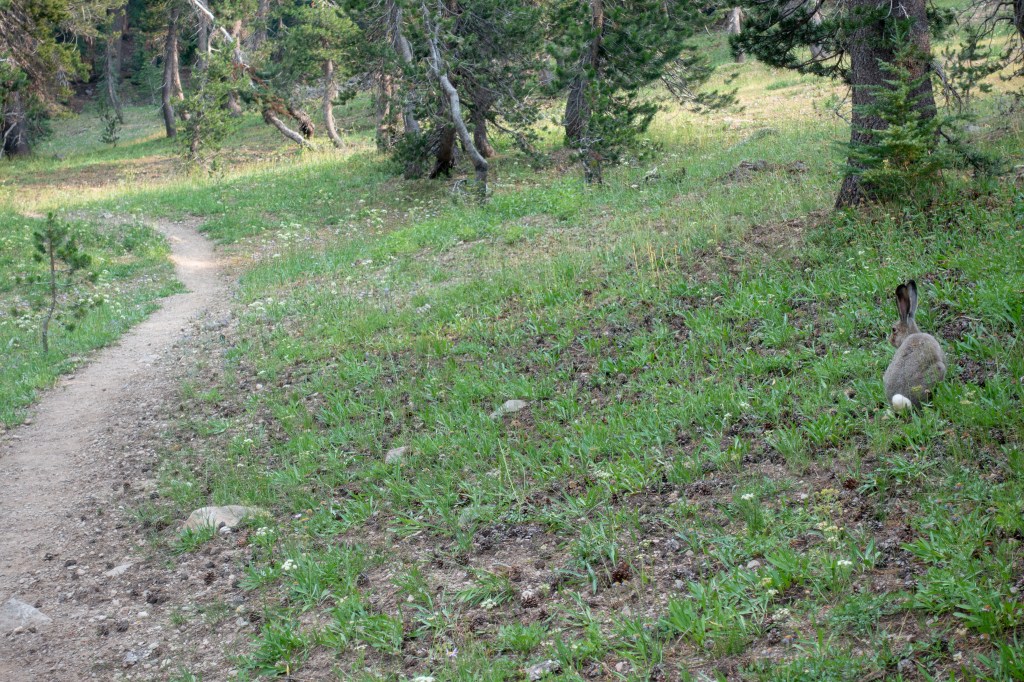 Morale and energy flagging for the day, I sit down for a snack to help me power through until the next campsite option. A very large rabbit with a snowy cottontail hops around grazing on flowers, wholly unconcerned by my presence. We enjoy a snack together in silence, then I’m on my way.