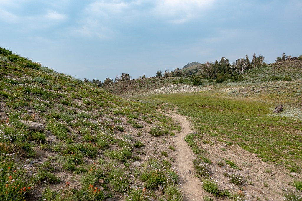 At least the landscape throws something new my way: a strange pyramid of black rock at the top of the climb. It is a geologic island, a pile of oddly colored stone distinct from everything else within view. It lords over a large meadow, uncharacteristically green and lush and exploding with wildflowers.